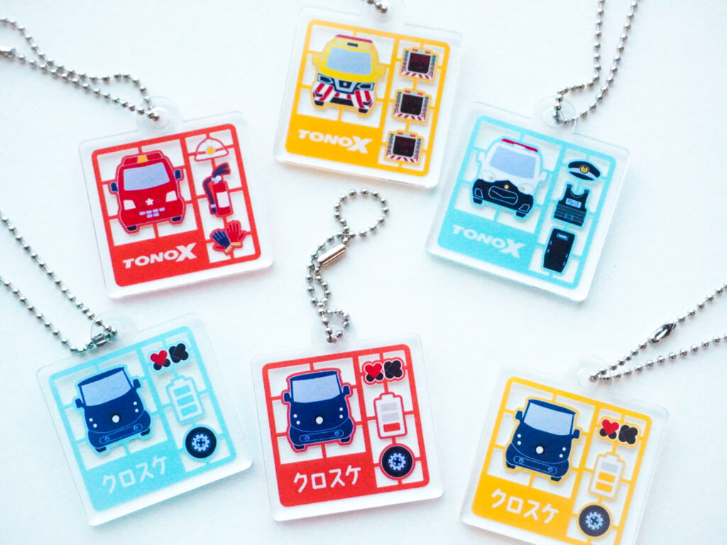 クロスケのインスタ(@kurosuke_xk)をフォローするとできるガチャガチャの景品のひとつとしてアクリルキーホルダーを作成しました。クロスケ3種類、トノックスの働く車3種類の計6種類展開です。クロスケの色ごとに、充電の残量が変わっていくところが推しポイントです。