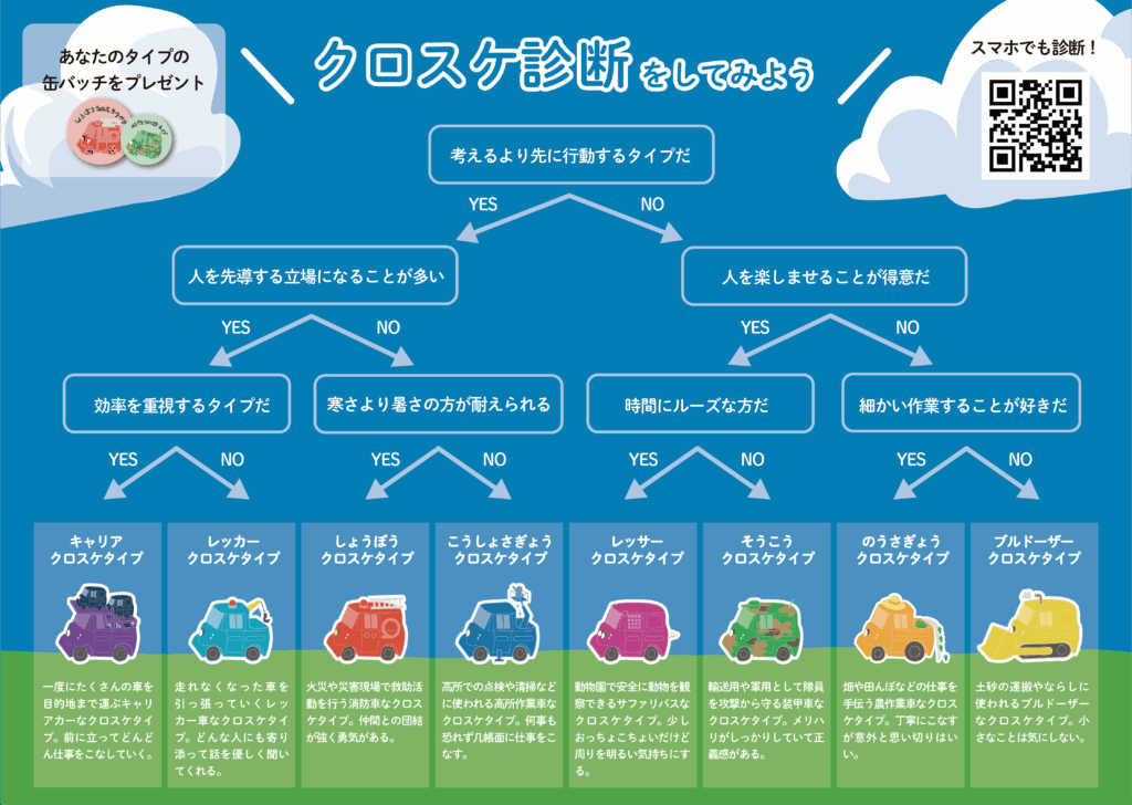WEBに誘導する仕掛けのひとつとして、自分のクロスケタイプがわかる診断を作成しました。当日は3つの質問に答えると、クロスケがこんなことにも使われたらいいなと想像した8種類のタイプの中から自分にあったクロスケの缶バッチをもらうことができました。