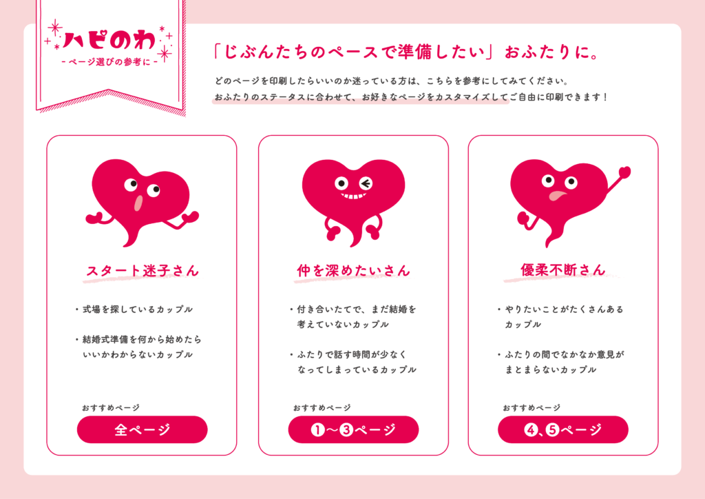 『ハピのわ』は、結婚に向けた準備の段階や目的に合わせて活用できる5つコンテンツで構成されています。すでに結婚式の準備を進めているおふたりはもちろん、これから結婚について考え始めるカップルの方にもご活用いただける内容になっています!おふたりの目的に応じてどのページからでも書き始めることができますが、もし迷ったときには、おふたりのステータスに応じておすすめしたいページがあります。どんなステータスのカップルの方でもこのノートを楽しく活用できるように工夫しました。