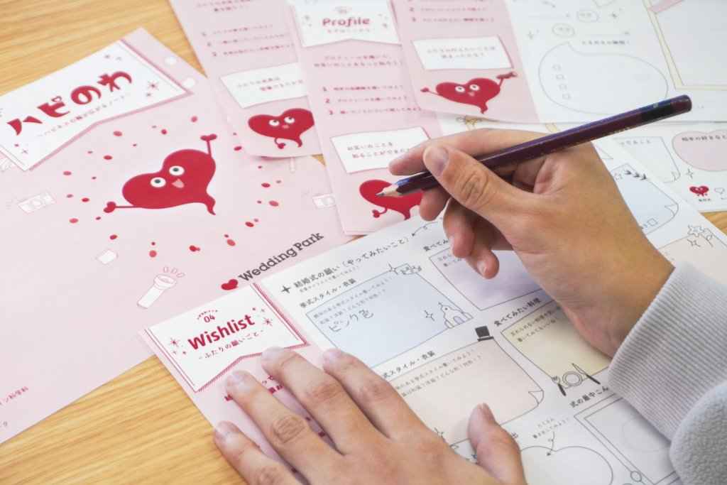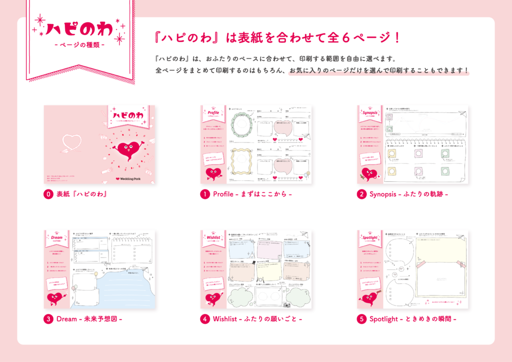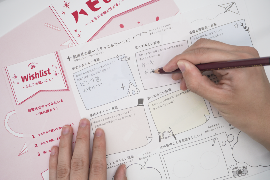 『ハピのわ』は、「結婚準備をやるべきタスクではなく、ふたりの未来を一緒に形にしていくワクワクする体験にしたい」という、想いから生まれたウエディングノートです。結婚準備の過程をノートに記録し、思い出として残せる構成が特徴です。